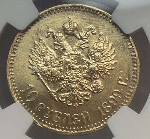 В центре изображен Малый Государственный Герб Российской империи - двуглавый орёл, головы которого увенчаны двумя коронами, третья, большая корона над ними. Все они соединены орденской лентой ордена Св. Апостола Андрея Первозванного. На груди орла расположен Московский герб, в щите изображен Георгий Победоносец с копьем поражающий дракона. Вокруг щита цепь ордена Св. Апостола Андрея Первозванного. На крыльях изображены гербы: Царства Казанского, Польского, Херсонеса Таврического, Астраханского, Сибирского, Грузинского, герб соединенных княжеств Киевского, Новгородского и Владимирского и герб Великого Княжества Финляндского — по 4 на каждое крыло. В правой лапе орла – скипетр, в левой – держава. Под ним слева направо изображены: номинал - надпись «10 РУБЛЕЙ» и дата выпуска «1899 Г.». По окружности канта имеются рельефные элементы, выполненные в виде зубцов.