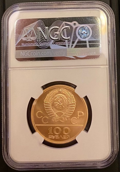 Сверху герб СССР с 15 витками ленты, слева от него буквы «СС», справа «СР», ниже двойная черта, под ней обозначение достоинства монеты цифра «100» и ниже слово «РУБЛЕЙ».