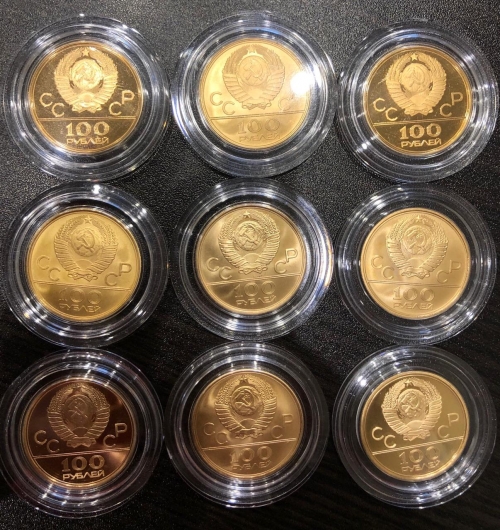 В 1977-1980 было выпущено шесть видов олимпийских монет из золота. Номинал монеты — 100 рублей, проба 900 (Au 900), вес — 17.45 г, диаметр — 30 мм, тираж 235 тыс. шт., монетные дворы: ЛМД, ММД. На лицевой стороне монеты изображение герба, на оборотной — олимпийские сооружения. Это первая монета СССР (с гербом СССР) чеканенная из золота, после длительного перерыва — легендарного золотого червонца РСФСР 1923 года