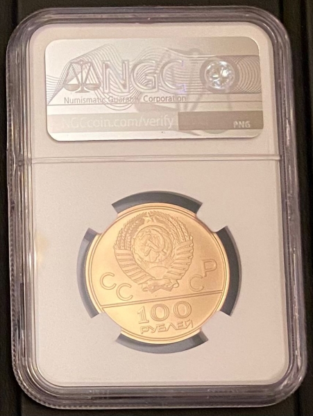Сверху герб СССР с 15 витками ленты, слева от него буквы «СС», справа «СР», ниже двойная черта, под ней обозначение достоинства монеты цифра «100» и ниже слово «РУБЛЕЙ».