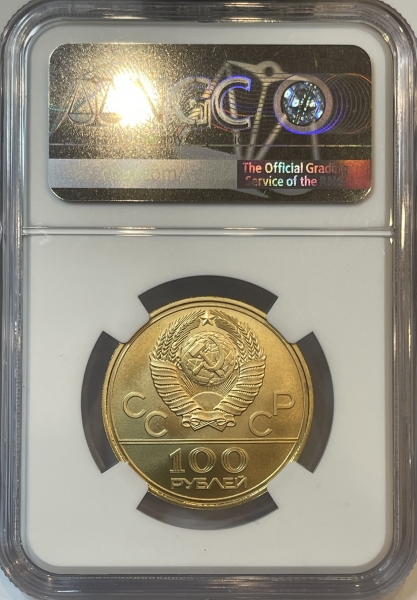 Сверху герб СССР с 15 витками ленты, слева от него буквы «СС», справа «СР», ниже двойная черта, под ней обозначение достоинства монеты цифра «100» и ниже слово «РУБЛЕЙ».