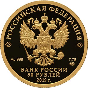 По центру изображен Государственный герб Российской Федерации, сверху вдоль канта – название страны «РОССИЙСКАЯ ФЕДЕРАЦИЯ», обрамленное с обеих сторон сдвоенными ромбами. Снизу горизонтально надпись в три строки – «БАНК РОССИИ, 50 РУБЛЕЙ, 2019 г.». Под гербом: слева – обозначения драгоценного металла и пробы сплава «Au999», справа – содержание химически чистого металла и товарный знак монетного двора «7,78 СПМД».