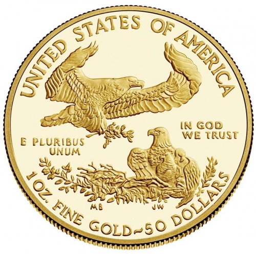 Реверс: изображён подлетающий к гнезду орел, держащий в когтях оливковую ветвь. В гнезде сидит самка орла с только что вылупившимися птенцами, что символизирует американские семейные ценности и традиции. Сверху заглавными буквами написано «United States of America» (Соединенные Штаты Америки). Слева на реверсе – надпись латинскими буквами «E Pluribus Unum» (то есть «Из многих единое»), в то время как слова «In God We Trust» («На Бога уповаем»), соответственно, расположены справа. Под орлиным гнездом указан тройский вес монеты, присутствует надпись «Чистое золото», а также – в виде арки – соответствующий номинал.