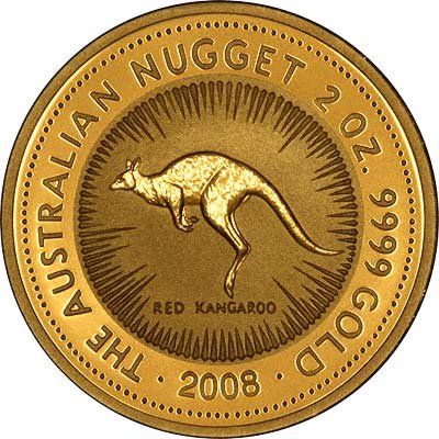 Реверс: Изображение кенгуру — символа пятого континента. Изображение меняется каждый год. Надпись AUSTRALIAN KANGAROO — австралийский кенгуру. Также указаны год выпуска монеты, вес 1 oz и 0.9999 проба золота. На монете 2007 года есть надпись THE AUSTRALIAN NUGGET, откуда и пошло название монеты.