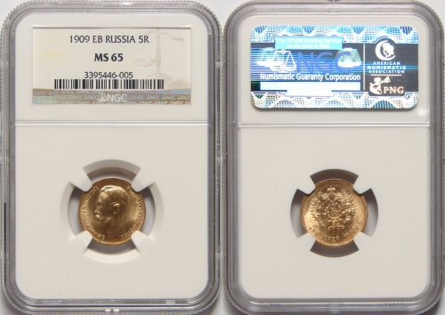 В 1909 году, после небольшого перерыва, пятирублевая монета чеканилась Санкт-Петербургским монетным двором из золота 900 пробы. Сегодня стоимость такой золотой монеты зависит от стоимости металла, из которого она выполнена, её состояния и сохранности. Монета 1909 года встречается реже других, поэтому её цена заметно выше аналогов других годов. Также известна редкая разновидность этой монеты с гладким гуртом.