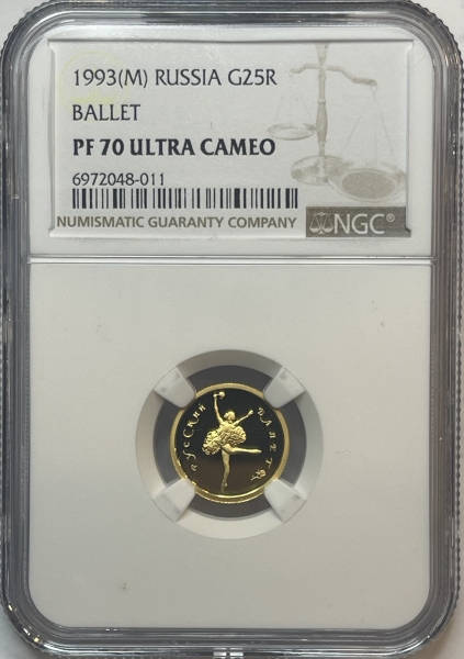 Золотая монета "Русский балет", 25 рублей, 1993 год, 3,11г., Au 999, ММД, в слабе NGC PROOF 70 ULTRA CAMEO