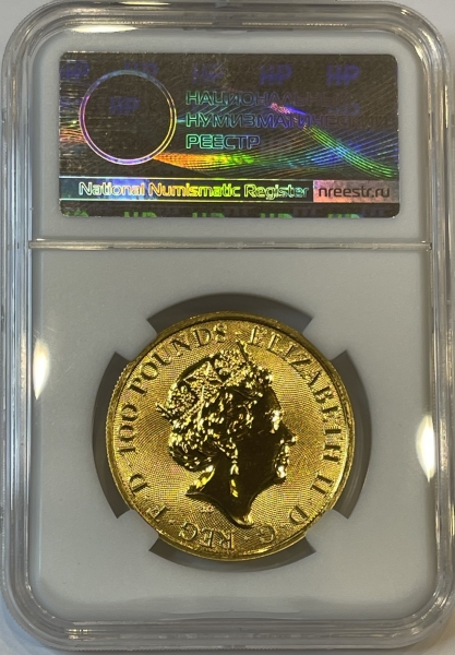 Золотая монета Великобритании 100 фунтов "Йель Бофорта" 2019 года 31,1 г. в слабе ННР MS 70